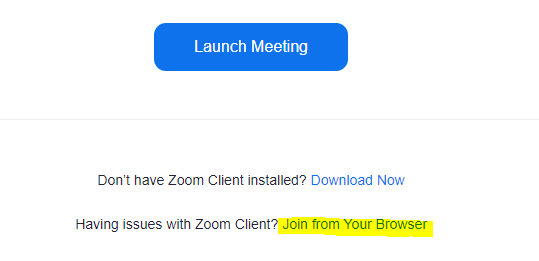 b. If you do not have Zoom downloaded on your computer, look below the “Launch Meeting” button. Click on the words “Join from Your Browser” in blue. This will open another tab, and you will follow the prompts to join the meeting.